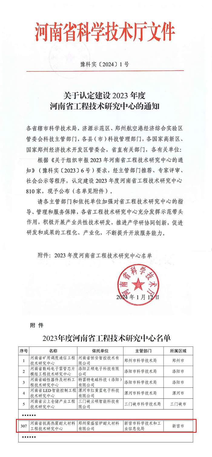 近日,河南省科學(xué)技術(shù)廳發(fā)布了《關(guān)于認(rèn)定建設(shè)2023年度河南省工程技術(shù)研究中心的通知》。經(jīng)申報(bào)、主管部門(mén)推薦、論證和研究等程序,鄭州榮盛窯爐耐火材料有限公司(以下簡(jiǎn)稱“榮盛耐材”)申報(bào)的“河南省抗高熱震耐火材料工程技術(shù)研究中心”正式獲批。