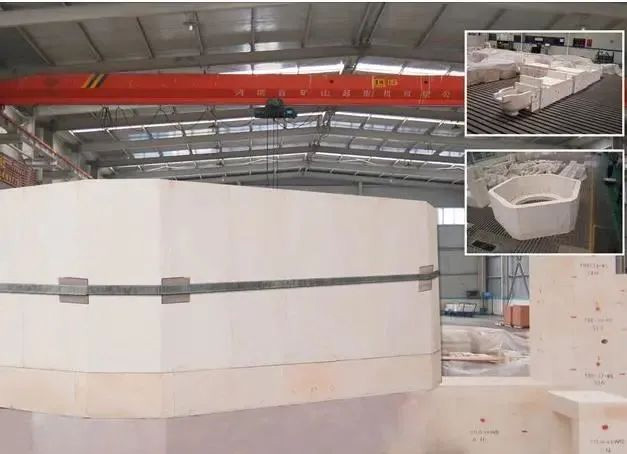 其產(chǎn)品優(yōu)點為:①使用了電熔氧化硅結(jié)合相,不含氧化鈣成分,二氧化硅含量可達98.5%以上;②密度更小(1.8g/cm3),降低了整個大碹的重量;③價格相比同級別電熔材料更低;④比硅磚具有更低的膨脹系數(shù)(650℃時0.6%)、更高的使用溫度(T0.5為1690℃);⑤更好的體積穩(wěn)定性。在國內(nèi)某全氧燃燒窯爐上有使用經(jīng)歷,但大碹出現(xiàn)威脅到窯爐的變形問題。