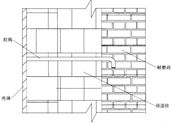 如圖4所示,為耐磨磚襯里+保溫磚型式,為解決膨脹每一定間隔留有膨脹縫,即耐磨磚與耐磨磚之間留有2mm的灰漿縫,耐磨磚分層采用焊在鋼殼上的拉鉤加固,而且為了把耐磨磚的質(zhì)量分層傳遞到鋼殼上,并在適當高度設(shè)有高溫?zé)釓婁撝频耐屑?。這種型式適合大面積平面或圓弧面。