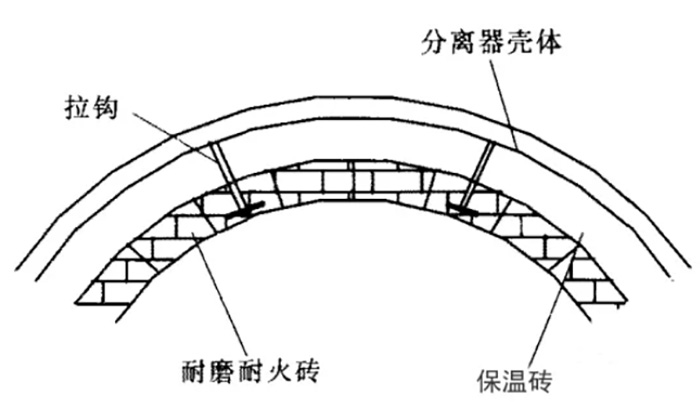 如圖7所示,為分層拉鉤磚結(jié)構(gòu)形式,在分離器的圓筒部分及錐段部分均采取楔形耐磨磚與拉鉤磚配合的這種結(jié)構(gòu),可有效防止耐磨耐火磚的脫落,使任何一塊獨立的耐磨耐火磚幾乎沒有可能脫落。