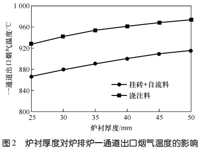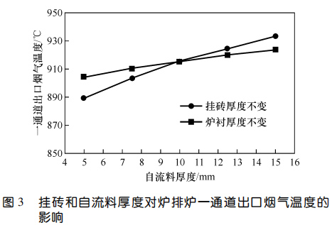 2、對于掛磚+自流料爐襯,掛磚厚度不變時,自流料厚度越大,一通道出口煙氣溫度越高;爐襯總厚度不變時,掛磚越厚、自流料層越薄,一通道出口煙氣溫度越低;爐襯各工作層厚度固定時,一通道出口煙氣溫度隨自流料熱導(dǎo)率的升高而降低,通過調(diào)整自流料熱導(dǎo)率,一通道出口煙溫差值可達 70 ℃。