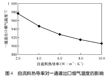 SiC 自流料熱導(dǎo)率對一通道出口煙氣溫度的影響圖4示出了自流料熱導(dǎo)率對一通道出口煙氣溫度的影響。可以看出,爐襯各工作層厚度固定時,一通道出口煙氣溫度隨自流料熱導(dǎo)率的升高而降低。通過調(diào)整自流料熱導(dǎo)率,一通道出口煙氣溫度差值高達 70 ℃。