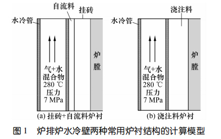 國內(nèi)外爐排爐在水冷壁內(nèi)襯結(jié)構(gòu)設(shè)計上有較大差別,國外爐排爐水冷壁內(nèi)襯結(jié)構(gòu)為鰭片(扁鋼)掛釘+SiC掛磚+SiC自流料填充密封,簡稱膜式壁結(jié)構(gòu);國內(nèi)則為水冷管錨固釘+SiC澆注料結(jié)構(gòu)。不同的爐襯材質(zhì)和結(jié)構(gòu)對水冷壁內(nèi)襯傳熱有較大影響,目前尚未見爐排爐水冷壁內(nèi)襯熱傳導(dǎo)研究報道。