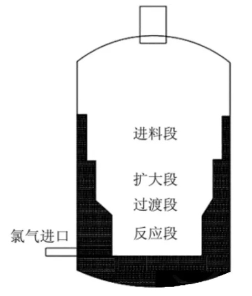 2、擴(kuò)大段。沸騰氯化爐上部是用于降低氣流速度,而使得未反應(yīng)的物料在重力作用下返回至反應(yīng)段繼續(xù)進(jìn)行反應(yīng),有效利用物料。
