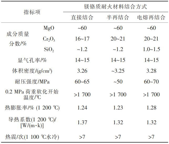 根據(jù)鎂鉻質(zhì)耐火材料的結(jié)合形式的不同,包括直接結(jié)合、半再結(jié)合、電熔再結(jié)合等鎂鉻質(zhì)耐火材料。其中,直接結(jié)合鎂鉻質(zhì)耐火材料是以高純燒結(jié)鎂砂和鉻鐵礦為原料,將電熔鎂砂與鉻礦直接燒結(jié);半再結(jié)合鎂鉻質(zhì)耐火材料是以電熔鎂鉻砂作屬粒,加入部分鉻礦和鎂砂或燒結(jié)合成鎂鉻料作細(xì)粉,高溫?zé)Y(jié)而成;電熔再結(jié)合鎂鉻質(zhì)耐火材料是將鉻礦與電熔鎂砂在電爐中電熔,制得電熔鎂鉻砂,再高溫?zé)Y(jié)而成。3類鎂鉻質(zhì)耐火磚材料特性對比,見表1。