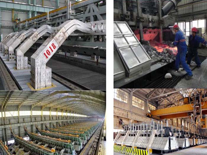 鋁電解槽通常為矩形鋼殼,內襯碳磚。電解槽中懸有一碳陽ji,其碳質槽底為陰ji。電解還原出來的金屬鋁熔體沉積于槽底陰ji。陽ji放出的氧與碳陽ji反應生成CO與CO2。槽內電解質與鋁保持熔融狀態(tài),隔一定時間從槽內放出鋁液,并向槽內加入一定量的Al2O3與冰晶石(3NaF.AlF3)等。電解溫度為900~1000℃。