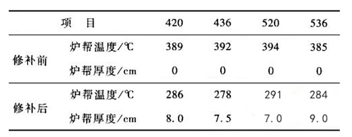 電解槽側部內襯破損部位修補前后爐幫溫度及爐幫厚度的測量對比分析結果見表2。