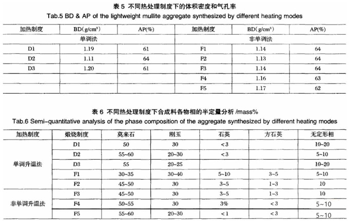 從表5可看出,在一種單調(diào)式升溫方式下,隨著保溫時(shí)間的延長(zhǎng),合成輕質(zhì)莫來石骨料的體枳密度呈現(xiàn)先升后降的趨勢(shì),顯氣孔率呈現(xiàn)先降后升的趨勢(shì),這與保溫過程中莫來石化程度相關(guān)。