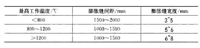 ②現(xiàn)場澆注的爐體?,F(xiàn)場澆注的耐火澆注料爐體留設膨脹縫的間距和寬度。可參考表1所示。表中數(shù)值適用于黏土質和高鋁質耐火澆注料。