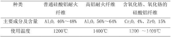 硅酸鋁耐火纖維又稱為陶瓷纖維,其主要組成是SiO2、Al2O3、Fe2O3、K2O、Na2O等,其中SiO2和Al2O3占95%以上,F(xiàn)e2O3約占0.98%,K2O和Na2O約占0.5%。硅酸鋁纖維的表面光滑,內部固相物質以連續(xù)骨架形式存在,配合間隙中的低熱導率空氣,起到了保溫效果。生產硅酸鋁耐火纖維的方法是將精選的焦寶石原料在2000℃以上的電爐里融化,再采用噴吹或離心等方法使之纖維化。硅酸鋁耐火纖維按照其成分和使用溫度可以分為3類,如表2所示: