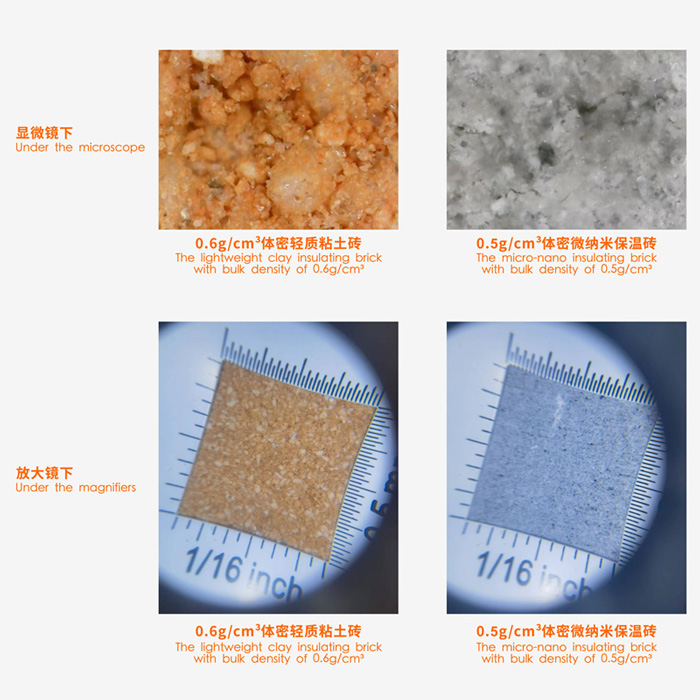 將體積密度0.6 g/cm3的普通粘土質(zhì)輕質(zhì)保溫磚和體積密度0.5 g/cm3的微納米保溫磚同時(shí)在1050℃下保溫3小時(shí)燒后,普通粘土質(zhì)輕質(zhì)保溫磚由230mm收縮到190mm,磚體嚴(yán)重變形,而新型保溫磚尺寸未發(fā)生變化,外觀完好。